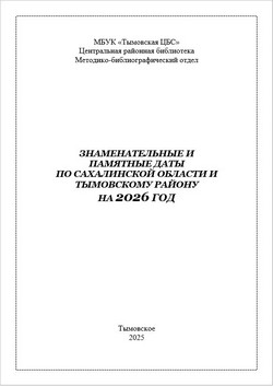 Знаменательные и памятные даты по Сахалинской области и Тымовскому району на 2026 год / МБУК «Тымовская ЦБС». ЦРБ. МБО ; сост. Н. П. Кукушкина. – Тымовское, 2025. - 8 с.