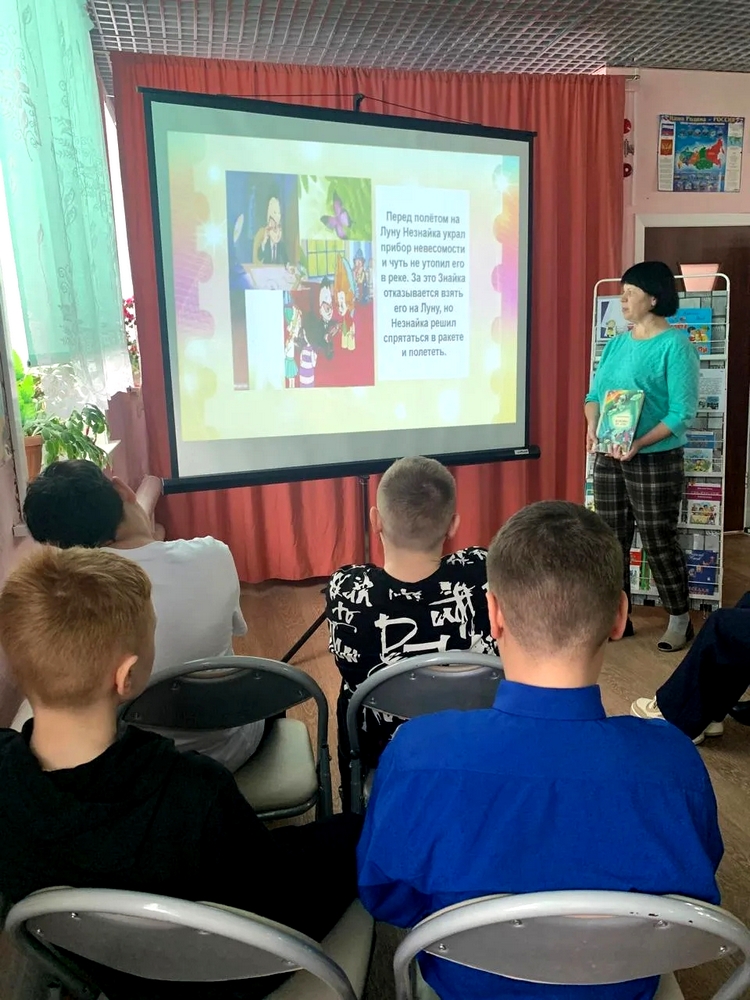 «Сказочный мир Носова: от Земли до Луны». В ходе мероприятия ребята ознакомились с увлекательными приключениями Незнайки и его друзей на Луне, обсудили главные темы и персонажей произведения. После чтения и беседы была проведена викторина, в которой участники с удовольствием отвечали на вопросы.
