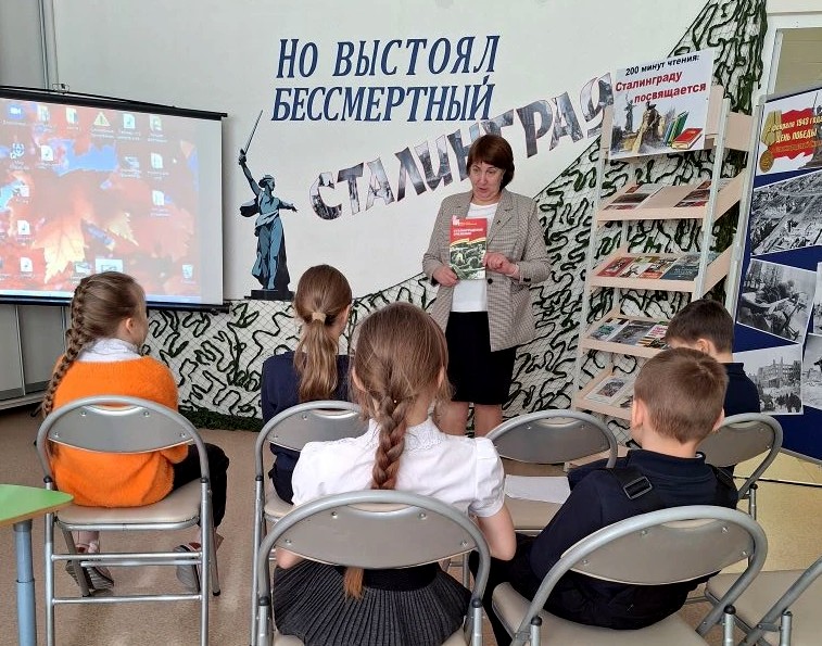Библиотекарь представила ребятам лучшие книги о Сталинградской битве, написанные специально для детей. Эти истории о подвиге всегда ждут своих читателей на библиотечных полках.