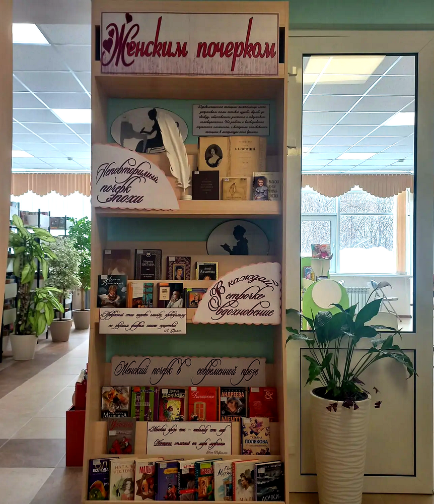 Тематический стеллаж «Женским почерком» позволяет прикоснуться к прекрасному и выбрать книгу для души, чтобы праздник 8 марта стал не только днем тюльпанов, но и днем хорошей книги.
