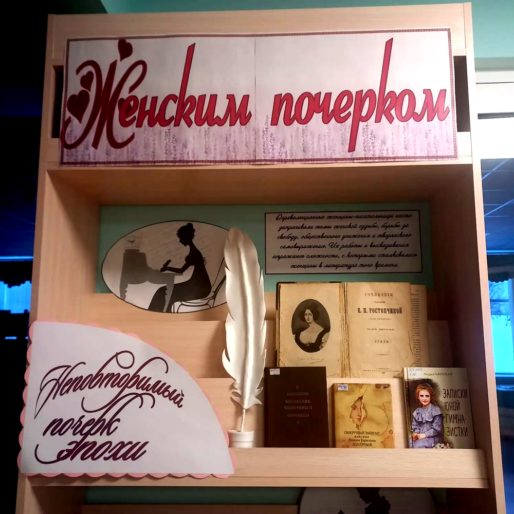 «Женским почерком». Это не просто выставка книг, а настоящее признание в любви прекрасным дамам, которые взяли в руки перо. Работники библиотеки решили проследить, как менялся «почерк» женщин в литературе на протяжении столетий, и объединили на одном стеллаже три уникальных раздела, три взгляда на женскую литературу: