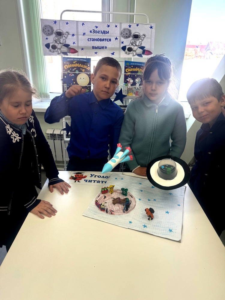 В начале мероприятия ребята вспомнили, кто был первым космонавтом, что космическая ракета Юрия Гагарина называлась «Восток», а также ознакомились с книгами о космосе с выставки «Звёзды становятся выше».