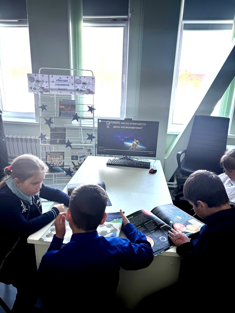 «Звёзды становятся выше», которую ребята посмотрели с большим интересом. На выставке представлены иллюстрированные книги, которые позволят юным читателям познакомиться с историей развития космонавтики, расширить свои знания о Вселенной, узнать много нового о древней науке астрономии, мире звёзд и галактик, понять, из чего состоит Солнечная система и откуда прилетают кометы, для чего нужны искусственные спутники и многое другое.
