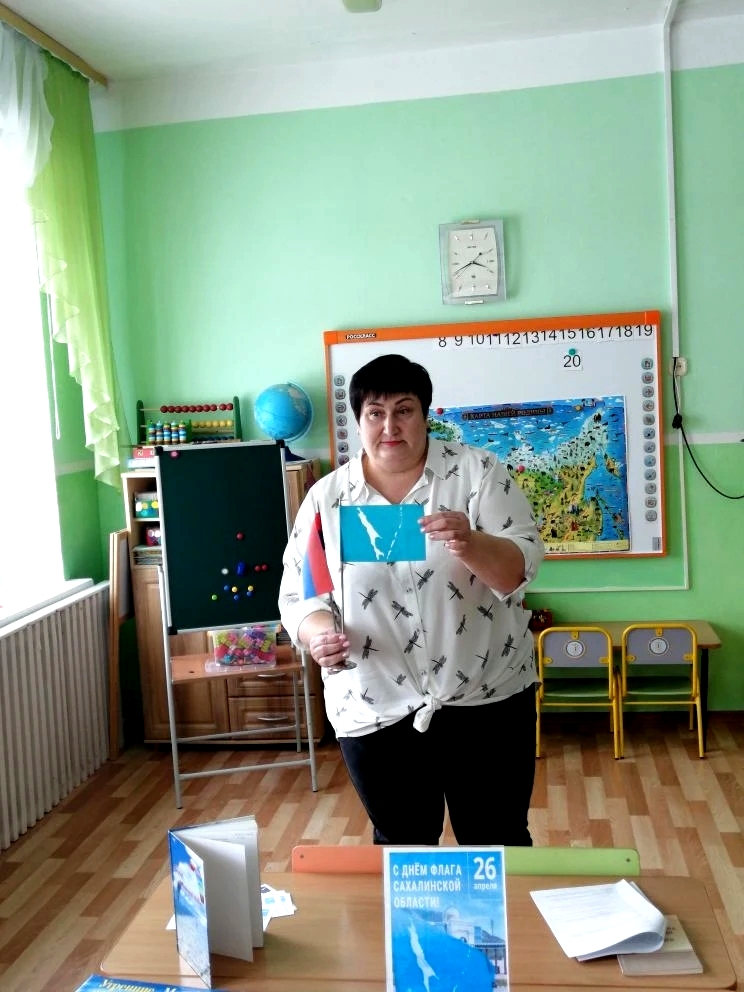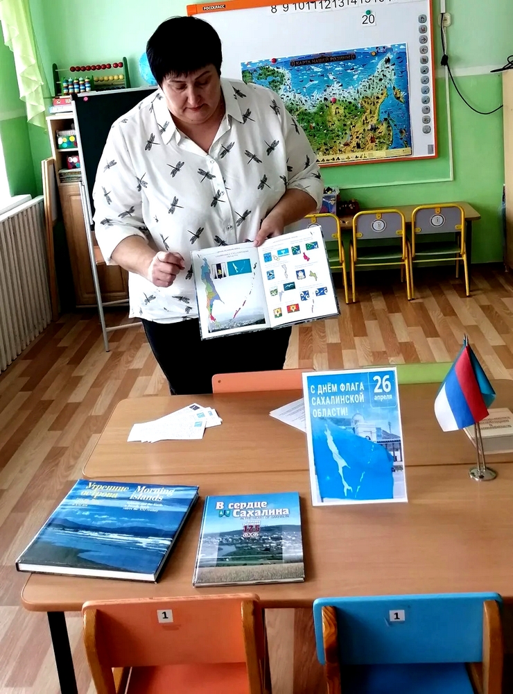 «Флаг Сахалина – символ островного региона» для воспитанников старшей группы МБДОУ с. Воскресеновка. На мероприятии ребята узнали об истории создания флага Сахалинской области, а также об уникальности этого главного символа нашего региона. Он единственный в стране представляет собой карту области - Сахалин и Курилы на фоне цвета морской волны, что делает его самым узнаваемым среди флагов других субъектов. Флаг отображает географические особенности островного региона, подчеркивает, что Сахалин и Курилы - неотъемлемая часть России. Белый цвет Сахалина и Курильских островов на флаге символизирует благородство, чистоту и независимость, бирюзовое полотнище олицетворяет океан, свободу и открытость. Глядя на него, чувствуешь свою принадлежность к островной земле, к большой и дружной семье сахалинцев и курильчан, ведь за официальной символикой области стоит многолетняя история, подвиги и труд огромного количества наших земляков и тех, кто открывал и осваивал дальневосточные территории.