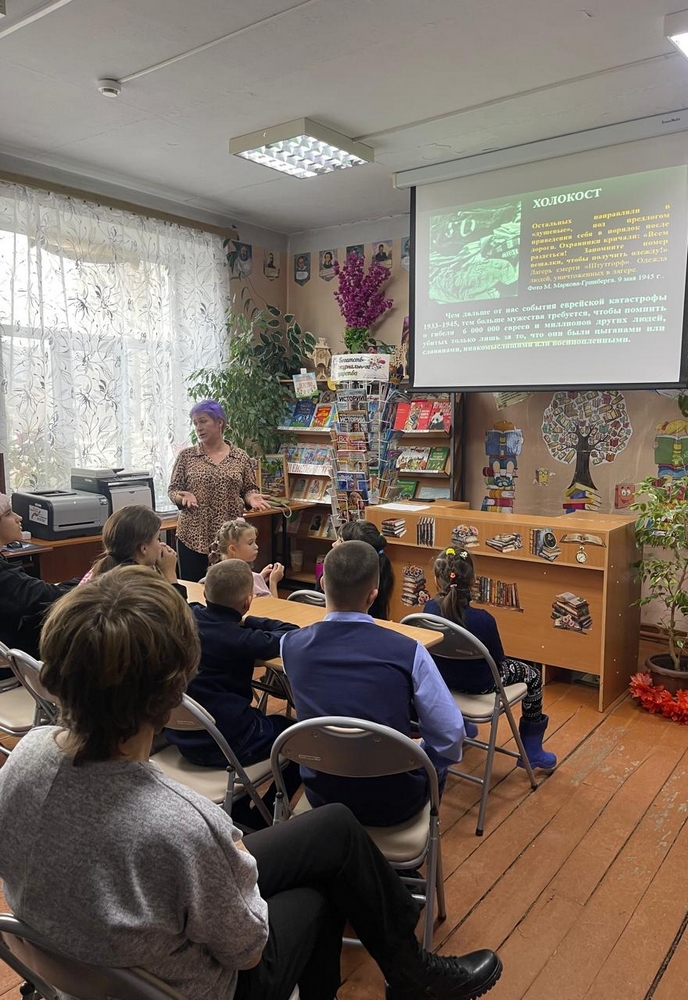 «Нет фашизму на планете!» для воспитанников ГКУ СРЦН «Добродея». Библиотекарь ознакомила ребят с тематической презентацией, вместе раскрыли понятия «фашизм», «расизм», «антисемитизм», «геноцид», ознакомились с понятием «ХОЛОКОСТ», узнали, откуда появилось название «Хрустальная ночь» («Ночь разбитых витрин»). Ребятам напомнили о страшных фактах жизни узников концлагерей Бухенвальда, Майданека, Дахау, Освенцима и Саласпилса. Знание этого всего необходимо для того, чтобы подобные зверства не повторились против какого - либо народа на Земле. А чтобы не повторились подобные события, которые уносят миллионы невинных жизней, мы должны быть терпимыми к другим людям, вне зависимости от расы, нации, вероисповедания и других отличий. В борьбе против подобных страшных процессов важно обращаться к прошлому человечества, анализировать причины, механизмы возникновения и развития нетерпимости. Пока мы помним – мы живы. И жива память о миллионах погибших в аду Холокоста.