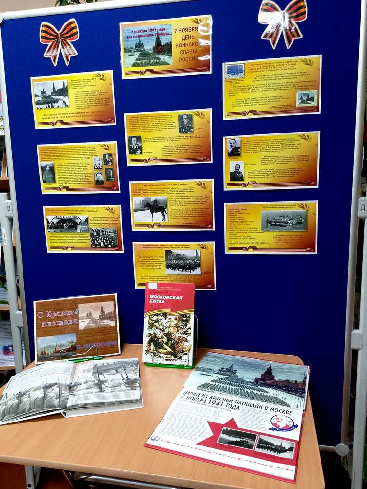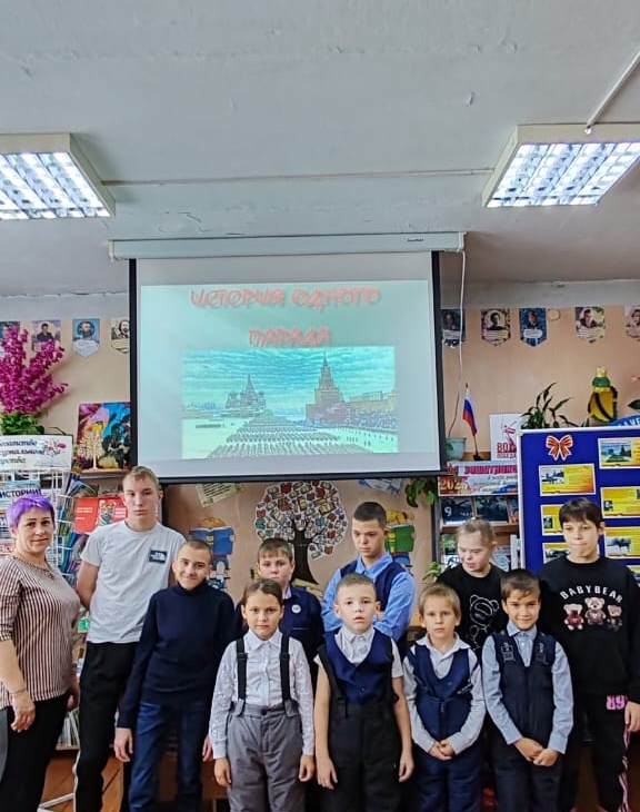 «История одного парада» для воспитанников ГКУ СРЦН «Добродея», посвященный этому историческому событию. Библиотекарь рассказала ребятам о том, что парад 7 ноября 1941 года проходил во время Московской битвы, когда линия фронта была всего в нескольких десятках километров от города. Этот парад по силе воздействия на ход событий приравнивается к важнейшей военной операции. Он имел огромное значение по поднятию морального духа армии и всей страны, показав всему миру, что Москва не сдается, и боевой дух армии не сломлен. Многие военные подразделения после окончания парада отправились прямиком на фронт.