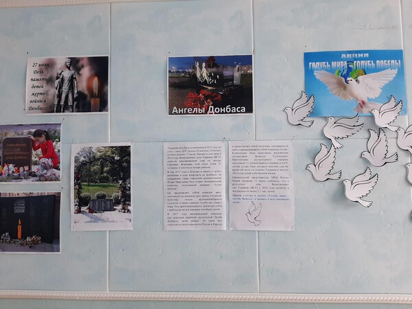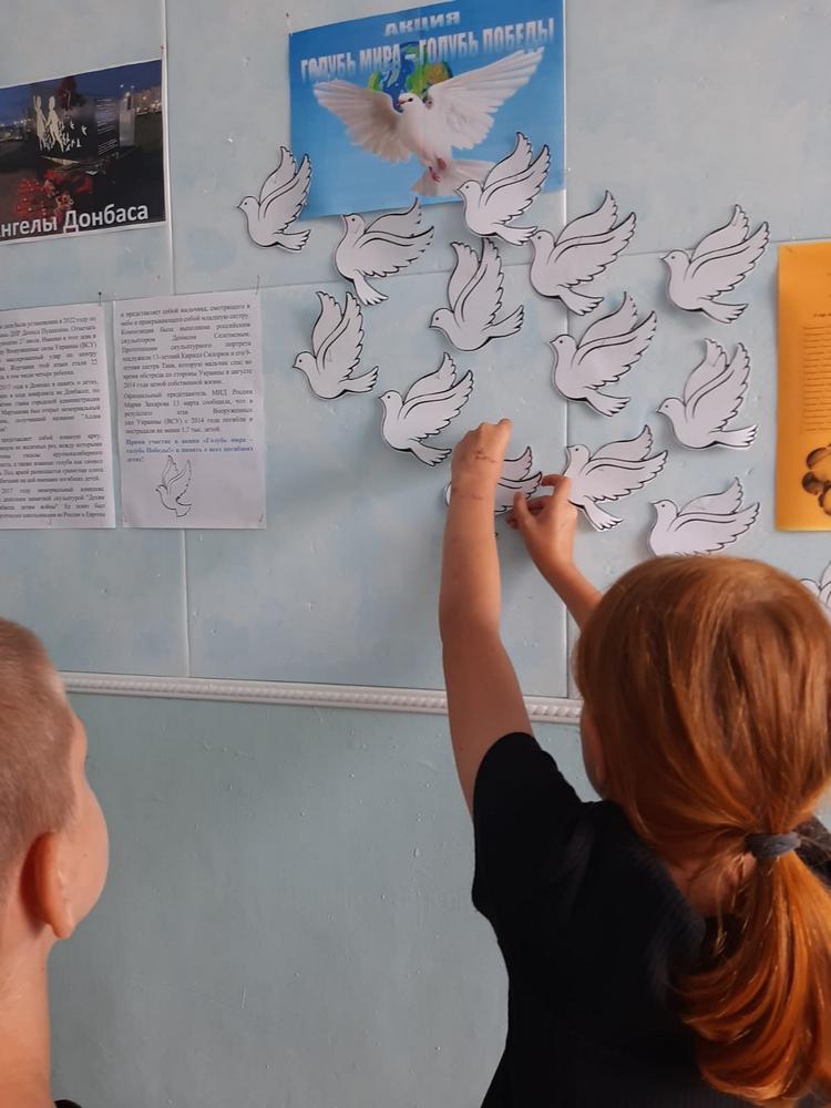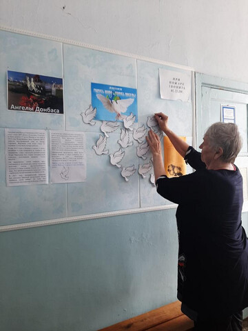 В память о Белых ангелах Донбасса посетители библиотеки прикрепляли белых голубей, участвуя в акции «Голубь мира – Голубь Победы».