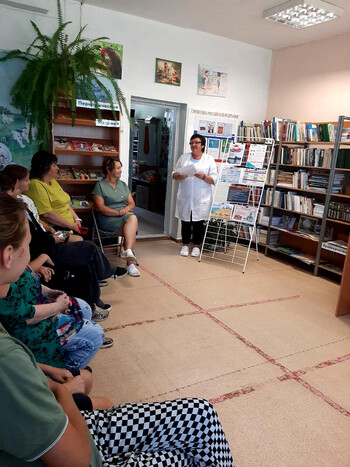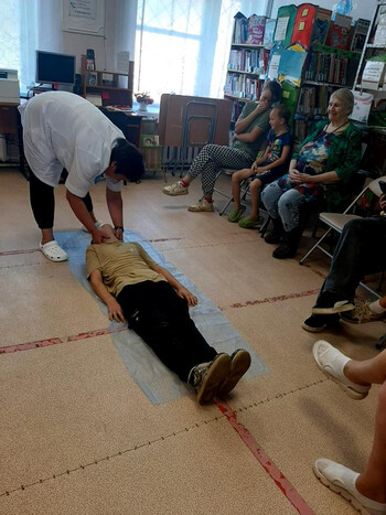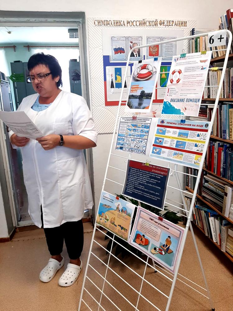 В библиотеке был оформлен информационный стенд, на котором были представлены советы по оказанию первой помощи пострадавшим в результате несчастного случая. Наталья Дмитриевна подробно рассказала о том, как помочь при переломах, потере сознания, утоплении и отравлении.